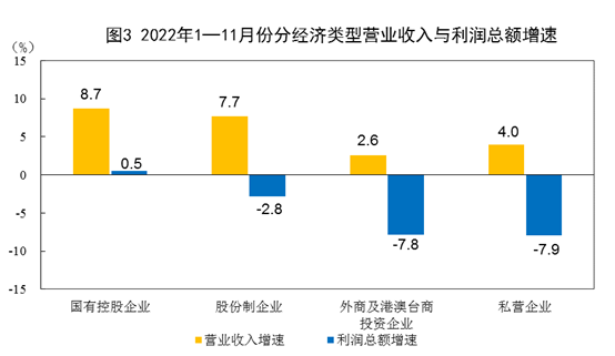 1—11月份,规模以上工业企业中,国有控股企业实现利润总额24049.7亿元,同比增长0.5%;股份制企业实现利润总额56412.0亿元,下降2.8%;外商及港澳台商投资企业实现利润总额18378.5亿元,下降7.8%;私营企业实现利润总额22636.9亿元,下降7.9%。