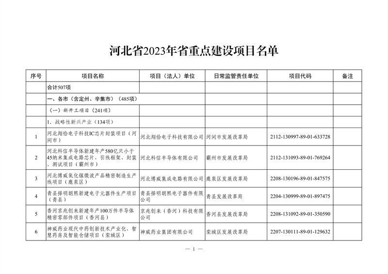 1月19日,河北发改委印发《河北省2023年省重点建设项目名单》。项目共计507项,总投资1.32万亿元,年度预计投资2600.1亿元。