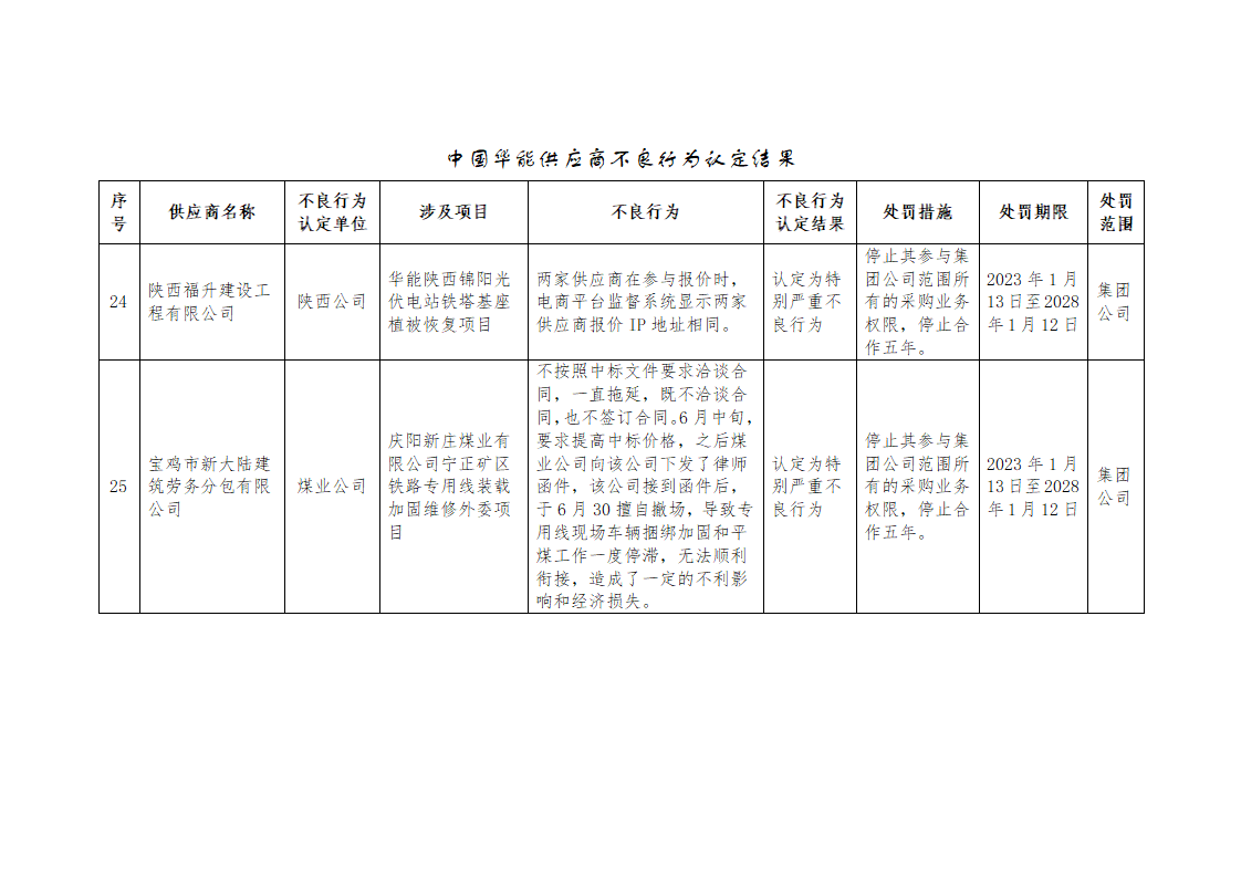中国华能关于供应商不良行为处理的公告