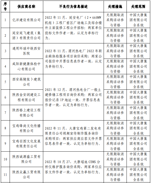 大唐集团有限公司关于供应商不良行为处理情况的公告 (2023年第1批)