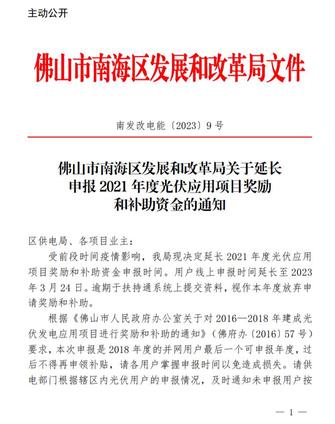 2月23日,广东省佛山市南海区发改局发布《关于延长申报2021年度光伏应用项目奖励和补助资金的通知》,受前段时间疫情影响,该局决定延长2021年度光伏应用项目奖励和补助资金申报时间。用户线上申报时间延长至2023年3月24日。逾期于扶持通系统上提交资料,视作本年度放弃申请奖励和补助。