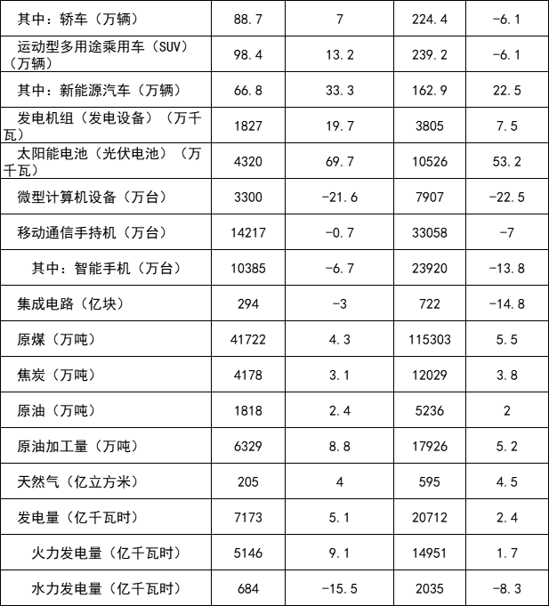 分产品看,3月份,620种产品中有347种产品产量同比增长。钢材12725万吨,同比增长8.1%;水泥20580万吨,增长10.4%;十种有色金属628万吨,增长6.9%;乙烯261万吨,增长3.6%;汽车260.8万辆,增长11.2%,其中新能源汽车66.8万辆,增长33.3%;发电量7173亿千瓦时,同比增长5.1%;原油加工量6329万吨,同比增长8.8%。