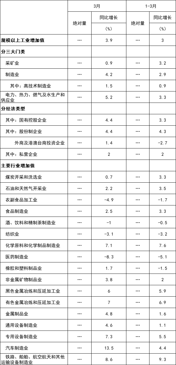 3月份,规模以上工业增加值同比实际增长3.9%(增加值增速均为扣除价格因素的实际增长率)。从环比看,3月份,规模以上工业增加值比上月增长0.12%。1—3月份,规模以上工业增加值同比增长3.0%。
