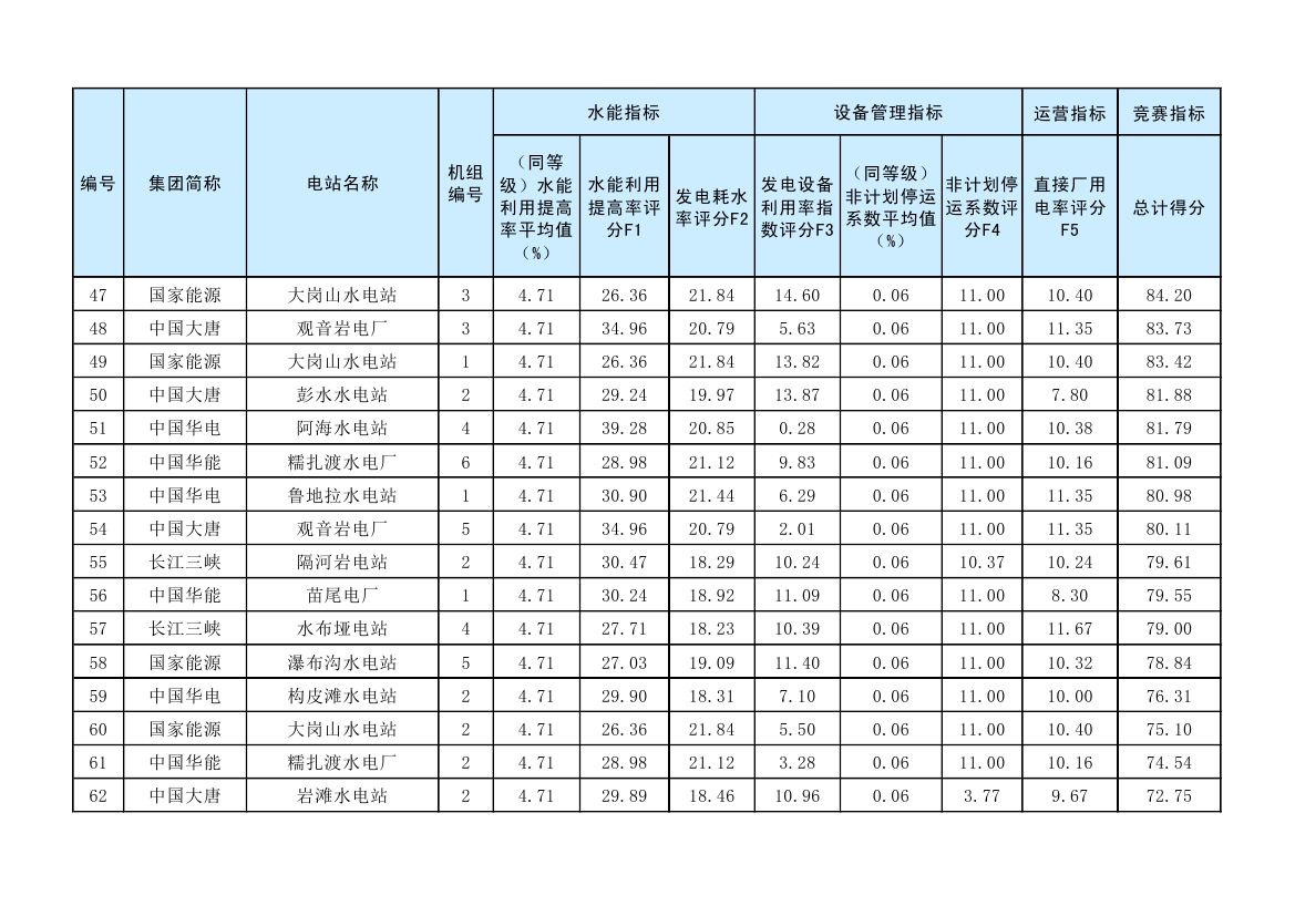 中国电力企业联合会科技开发服务中心发布关于公示2023年电力行业常规水力发电机组生产运行指标对标结果的通知,统计汇总了15 家发电集团(投资)公司所属 325 座常规水电站2022 年度对标相关数据,详情如下: