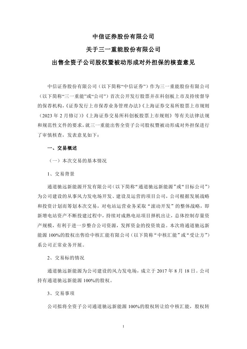 通道驰远新能源开发有限公司(以下简称“通道驰远新能源”) 为三一重能建设的从事风力发电场开发、建设及运营的项目公司,三一重能根据发展战略 和投资计划而筹划本次交易,对电站运营业务采取“滚动开发”的整体战略,即 新增电站资产不断投建过程中,持续对成熟电站项目择机出让,总体控制存量资 产规模,有利于进一步整合公司资源,发挥资金的投资效益。本次将通道驰远新 能源 100%的股权出售给中核汇能有限公司系公司正常业务开展。