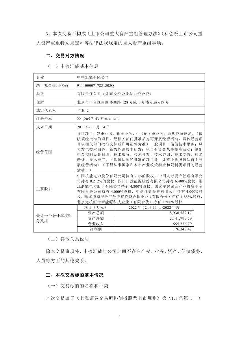 6月1日晚,中国核电发布公告称,其控股子公司中核汇能拟与三一重能签订股权转让协议,以3.19亿元的价格受让通道驰远新能源开发有限公司(以下简称“通道驰远新能源”)100%股权。