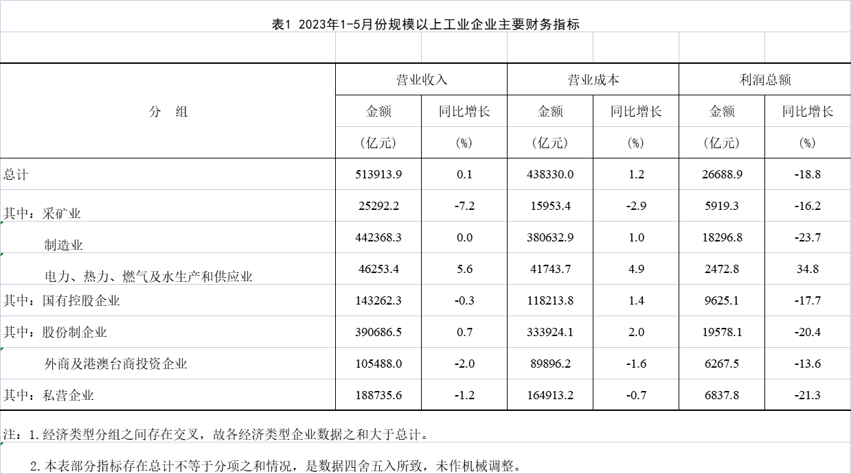 1—5月份,全国规模以上工业企业实现利润总额26688.9亿元,同比下降18.8%,降幅比1—4月份收窄1.8个百分点(按可比口径计算,详见附注二)。