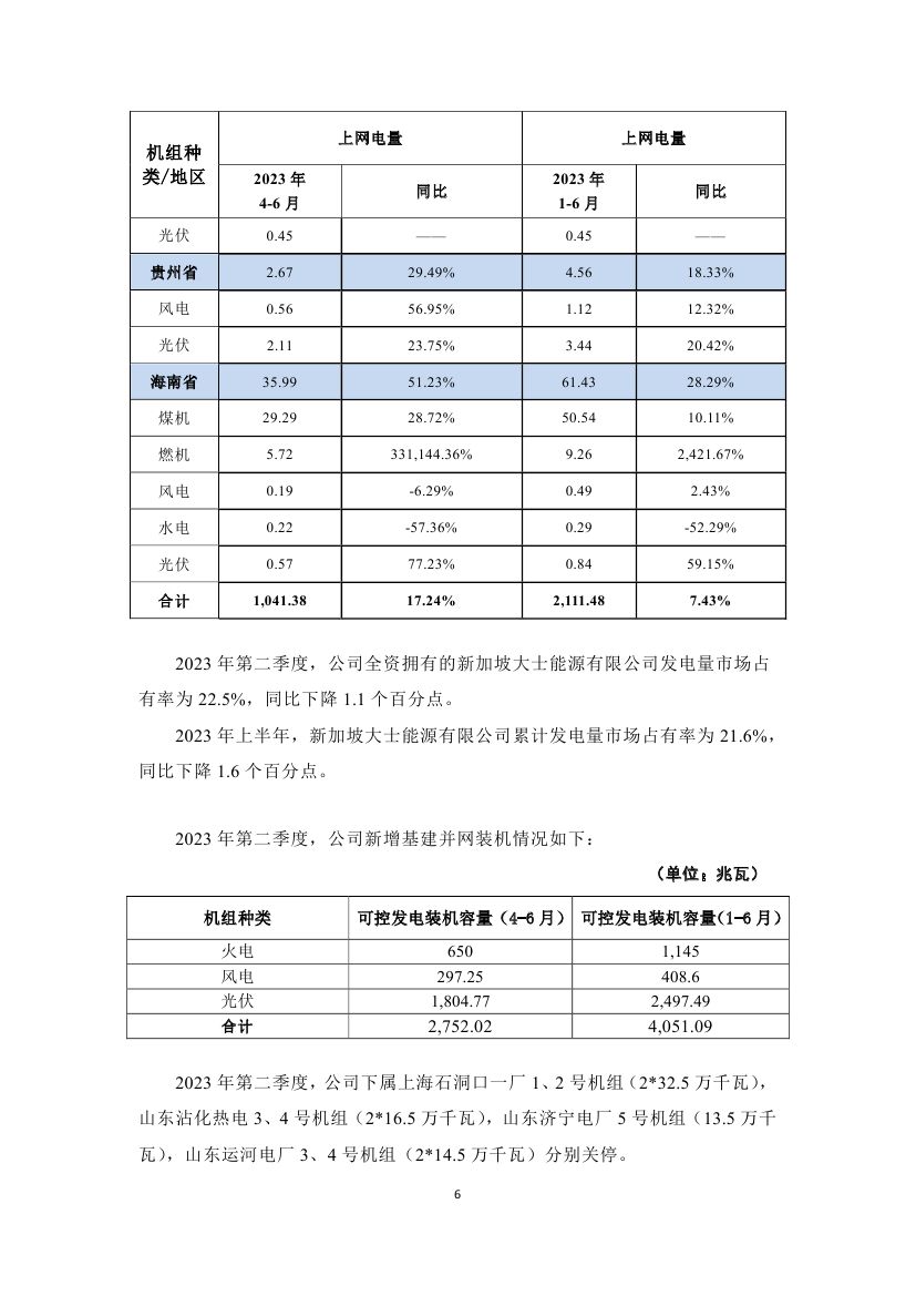 初步统计,2023年第二季度, 公司中国境内各运行电厂按合并报表口径完成上网电量1,041.38亿千瓦时,同比上升17.24%;2023 年上半年,公司中国境内各运行电厂按合并报表口径累计完成上网电量2,111.48亿千瓦时,同比上升7.43%。2023年上半年公司中国境内各运行电厂平均上网结算电价为515.23元/兆瓦时,同比上涨1.89%。2023年上半年,公司市场化交易电量比例为87.68%,比去年同期下降0.13个百分点。