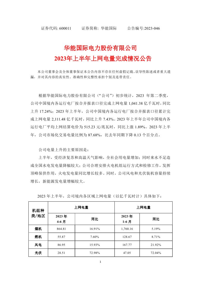 7月15日,华能国际发布2023年上半年上网电量完成情况公告。