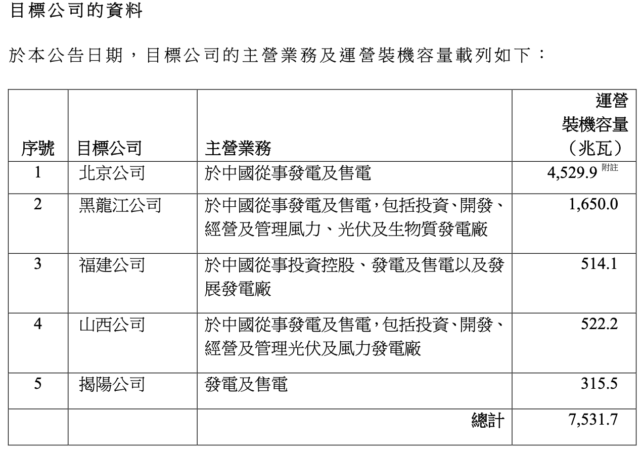 中国电力表示,此次收购的公司主要从事清洁能源发电,主要包括风力发电及光伏发电。本次涉及收购总容量为9268.3MW(包括已投运7531.7MW,在建1736.6MW)的发电项目。收购事项完成后,公司预计清洁能源装机容量占比将提升约6.9个百分点,将进一步巩固中国电力作为国家电投清洁能源旗舰上市附属公司的地位。