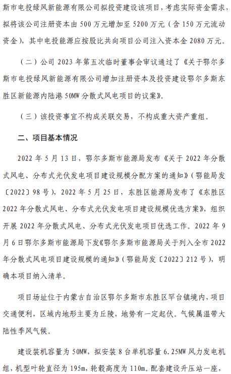 8月1日,电投能源发布了《关于鄂尔多斯市电投绿风新能源有限公司增加注册资本及投资建设鄂尔多斯东胜区新能源内陆港50MW分散式风电项目公告》。