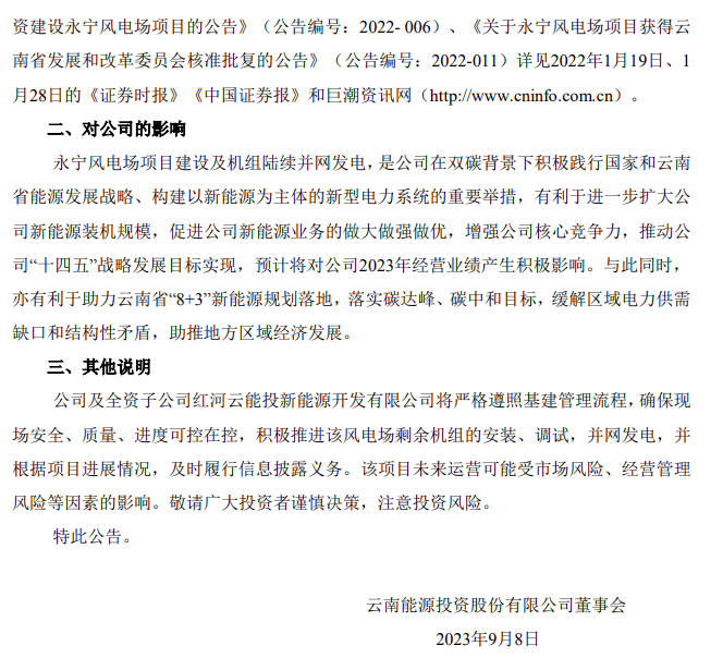 9月8号,云南能投发布《云南能源投资股份有限公司关于全资子公司红河云能投新能源开发有限公司永宁风电场项目后续风机并网发电的进展公告》。