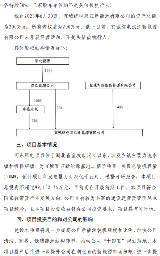 9月12日湖北能源发布《湖北能源集团股份有限公司关于投资建设综电汉江宜城河东150MW风电项目的公告》。