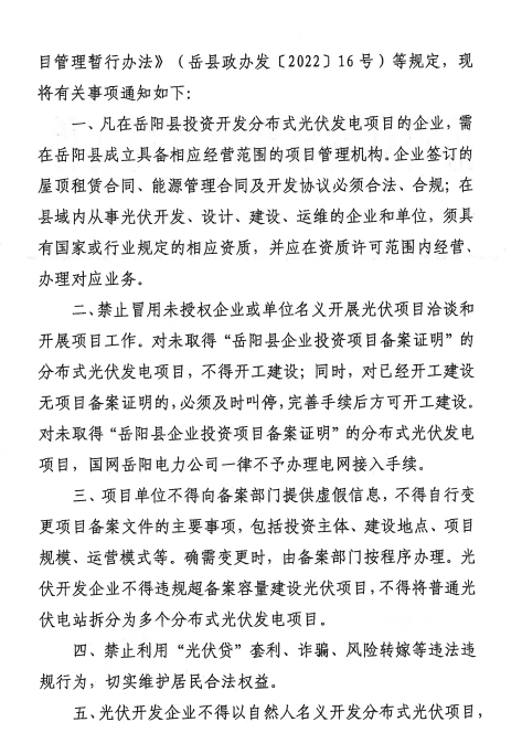 10月18日,湖南岳阳县人民政府发布关于进一步规范我县分布光伏发电项目建设管理秩序的通知。通知提出,禁止冒用未授权企业或单位名义开展光伏项目洽谈和开展项目工作。对未取得“岳阳县企业投资项目备案证明”的分布式光伏发电项目,不得开工建设;同时,对已经开工建设无项目备案证明的,必须及时叫停,完善手续后方可开工建设。对未取得“岳阳县企业投资项目备案证明”的分布式光伏发电项目,国网岳阳电力公司一律不予办理电网接入手续。