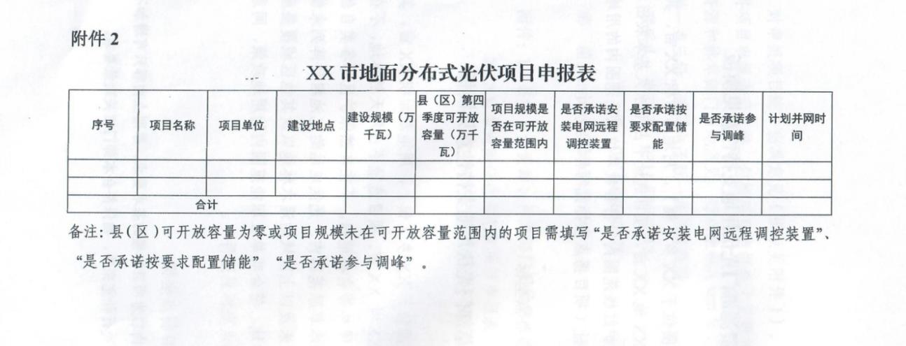 3.项目应具备电网接入和消纳条件。优先鼓励在有可开放容量的县(区)谋划布局地面分布式光伏项目,在可开放容量范围内的项目免除储能配建责任;可开放容量为零的县(区)或超出可开放容量申报的项目,需通过安装电网远程调控装置、配置储能(冀北电网和南网分别按照20%、15%比例配置,时长不低于2小时)、承诺参与调峰等方式开展项目建设。