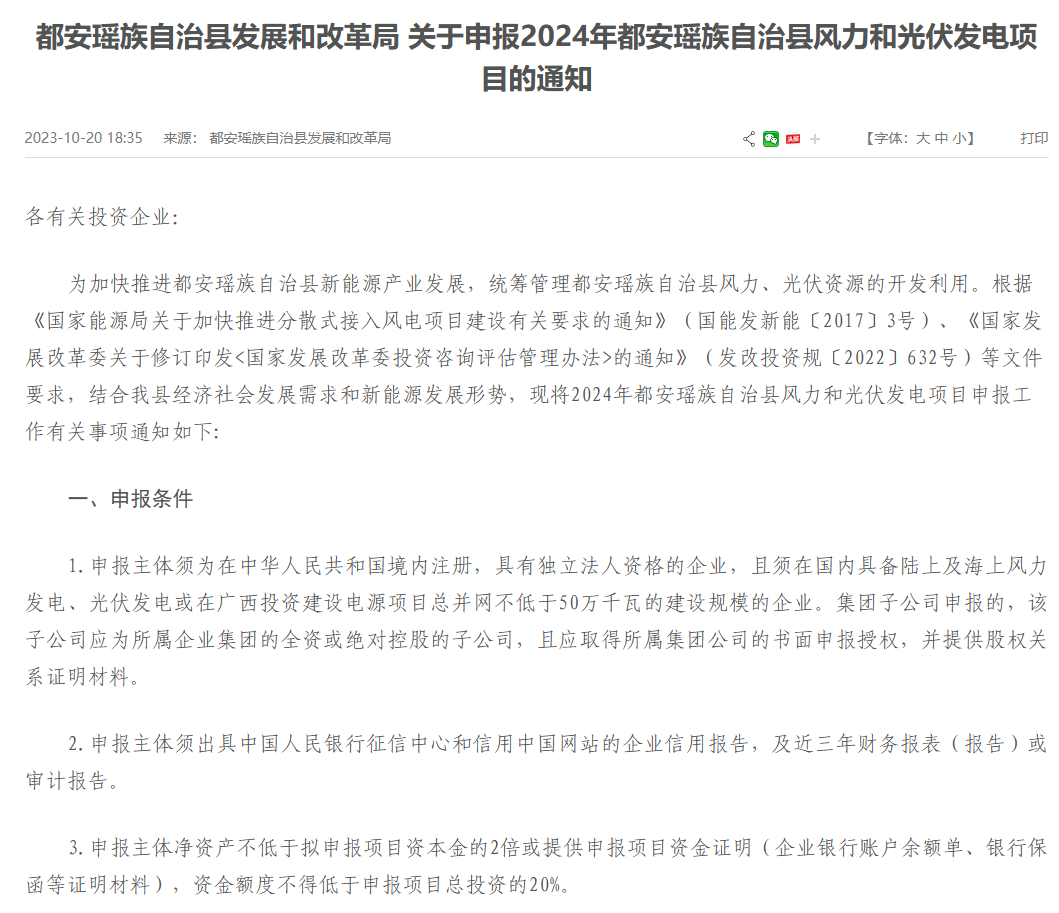 10月20日,都安瑶族自治县发展和改革局发布《关于申报2024年都安瑶族自治县风力和光伏发电项目的通知》。
