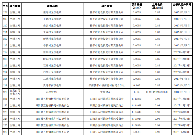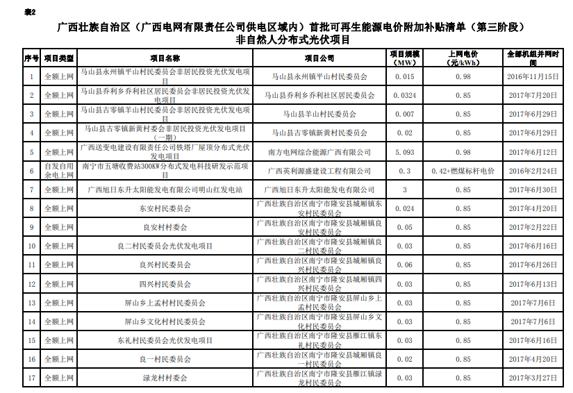 广西电网首批可再生能源发电项目补贴清单(第三阶段)
