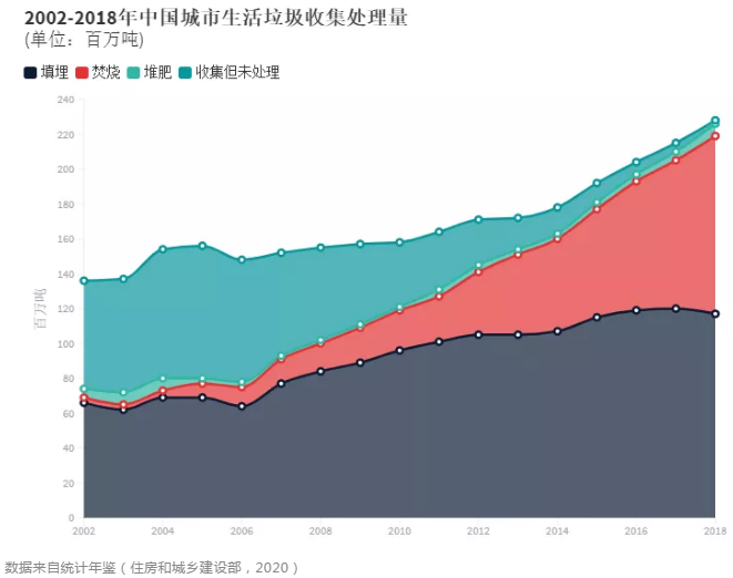 过去10年,中国为应对生活和工业垃圾的大量增加,在垃圾焚烧方面投入巨大。2018年的最新政府数据显示,收集垃圾的处置率达到99%,而这一数字在10年前仅为67%。