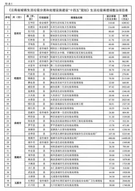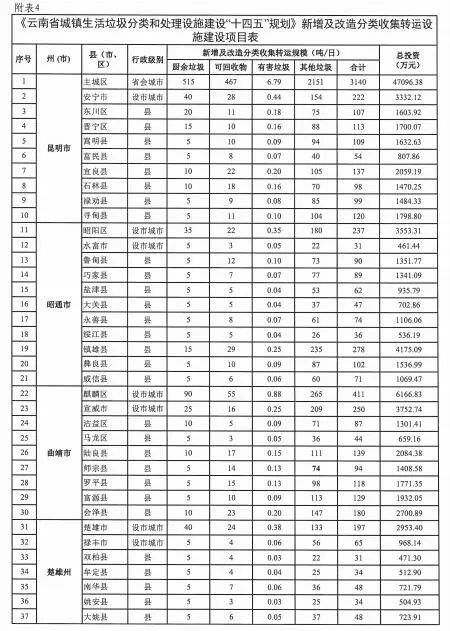 云南省住建厅发布《云南省城镇生活垃圾分类和处理设施建设十四五规划》,规划提到“十四五”期间,云南省城镇生活垃圾分类和处理设施建设的总体目标与主要任务。《规划》总投资约237.00亿元。其中新建生活垃圾焚烧发电厂项目150.61亿元,新建小型生活垃圾焚烧厂项目19.60亿元,新建厨余垃圾处理厂项目17.10亿元,新增及改造生活垃圾分类收转运设施项目20.61亿元,生活垃圾卫生填埋场整治项目29.08亿元。