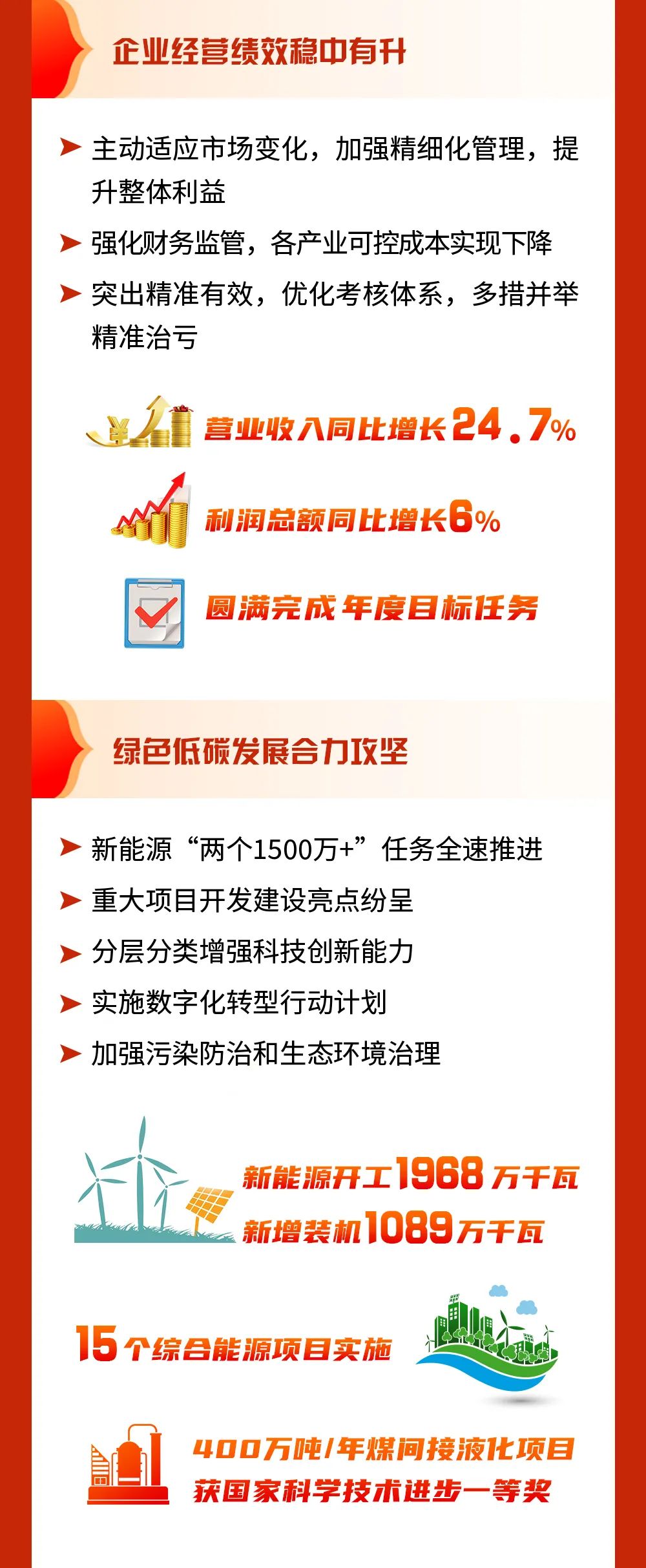 截至2021年底,国家能源集团风电装机达到5000万千瓦,保持世界第一;光伏装机达到860万千瓦,同比增长4.1倍,新能源开工1968万千瓦,新增装机1089万千瓦,创历史最好水平。2021年,国家能源集团企业经营绩效稳中有升。集团实现营业收入同比增长24.7%,利润总额同比增长6%,净利润同比增长7%,全员劳动生产率同比增长10.5%,利润总额、净利润、资产负债率等主要指标圆满完成。展望未来,张玉新表示,2022年国家能源集团将重点做好六个方面工作:着力强化能源安全保稳、业绩量增质升、转型走深走实、改革深化拓展、科技自立自强、党建巩固提升。
