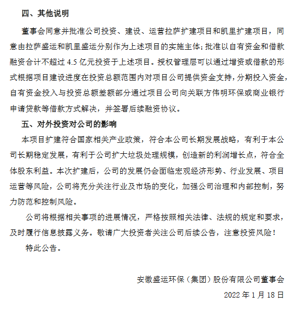 安徽盛运环保(集团)股份有限公司已投资、建设、运营拉萨盛运环保电力有限公司(以下简称“拉萨盛运”)及凯里盛运环保电力有限公司(以下简称“凯里盛运”)分别为 700 吨/日和 800 吨/日规模的生活垃圾焚烧发电项目,现已满负荷运营。为应对拉萨、凯里当地日益增长的生活垃圾处理压力,公司拟投资拉萨市生活垃圾焚烧发电扩建项目和凯里市生活垃圾焚烧发电扩建项目。拉萨扩建项目建成后将合计达到日处理垃圾量约 1050 吨、凯里扩建项目建成后将合计达到日处理垃圾量约1200吨。