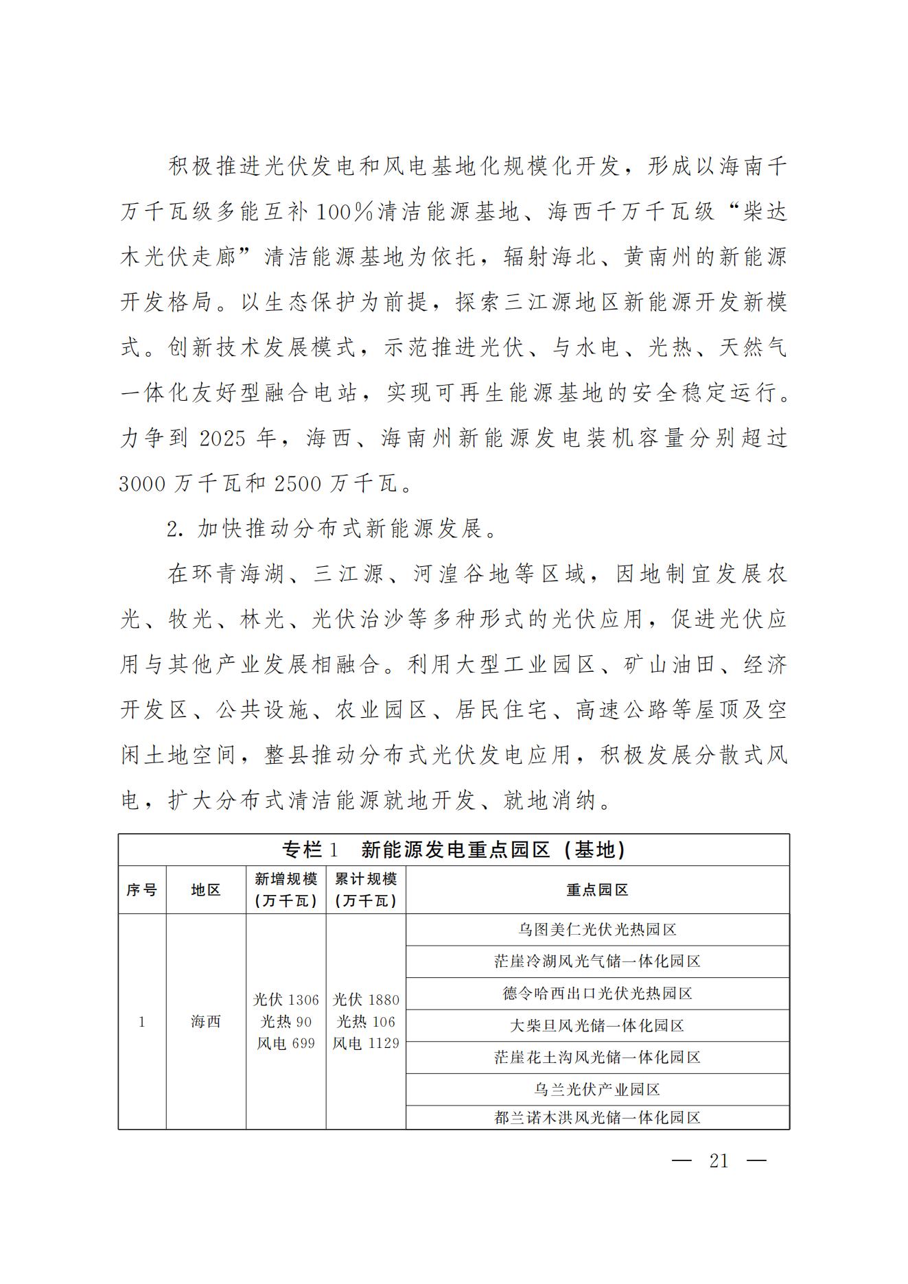 积极打造国家级光伏发电和风电基地。积极推进光伏发电和风电基地化规模化开发,形成以海南千万千瓦级多能互补100%清洁能源基地、海西千万千瓦级“柴达木光伏走廊”清洁能源基地为依托,辐射海北、黄南州的新能源开发格局。