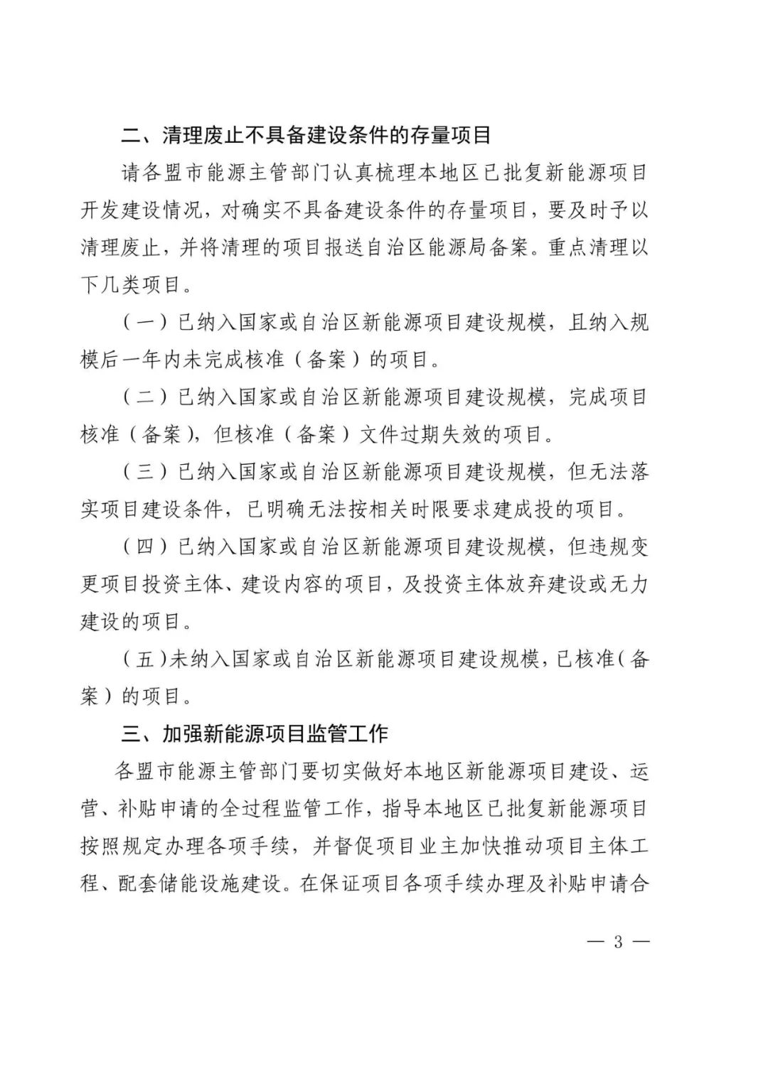 已纳入国家或自治区新能源项目建设规模,且纳入规模后一年内未完成核准(备案)的项目;完成项目核准(备案),但核准(备案)文件过期失效的项目;无法落实项目建设条件,已明确无法按相关时限要求建成投的项目;违规变更项目投资主体、建设内容的项目,及投资主体放弃建设或无力建设的项目。