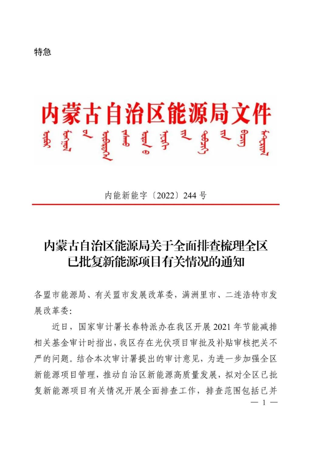 3月9日,内蒙古能源局发布特急文件《关于全面排查梳理全区已批复新能源项目有关情况的通知》(内能新能字(2022)244号),通知指出:针对光伏项目审批及补贴审核把关不严的问题,拟对全区已批复新能源项目有关情况开展全面排查工作,排查范围包括已并网、在建、待建的有补贴及无补贴新能源项目。