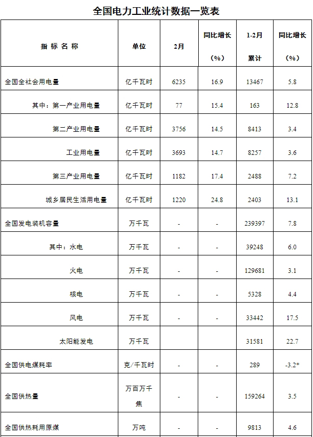 注:1.全社会用电量为全口径数据,全国供电量为调度口径数据。2.“同比增长”列中,标*的指标为绝对量;标▲的指标为百分点。