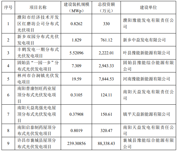 公司子公司鹤壁丰鹤发电有限责任公司(以下简称“丰鹤发电”)、南阳天益发电有限公司(以下简称“天益发电”)、新乡中益发电有限公司(以下简称“中益发电”)、河南豫能新能源有限公司(以下简称“豫能新能源”)拟设立4个整县屋顶分布式光伏项目公司,分别是在平顶山市叶县、南阳市新野县、新乡市长垣市、新乡市原阳县投资设立叶县豫能新能源有限公司、新野县豫能综合能源有限公司、长垣豫能综合能源有限公司、原阳县豫能综合能源有限公司,认缴出资金额共计19,250万元;公司子公司拟对外投资建设14 个屋顶分布式光伏项目,总建设装机规模 902.00792MWp,总投资额 356,957.62 万元。以上合计总投资 376,207.62 万元。