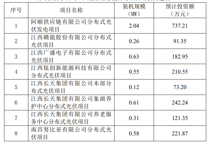 项目位于南昌市高新区火炬大街 298 号,建设装机容量为 0.12MW,建设工期 1 个月,本项目静态投资约为 73.20 万元,其中自有资金预计占项目总投资的30%,其余部分为银行贷款。 7、江西长天集团有限公司象湖养护中心分布式光伏项目 项目位于江西省南昌市南昌县东新二路南昌象湖老年养护中心,建设装机容 量为 0.61MW,建设工期计划1 个月,本项目静态投资约为242.24 万元,其中自 有资金预计占项目总投资的30%,其余部分为银行贷款。