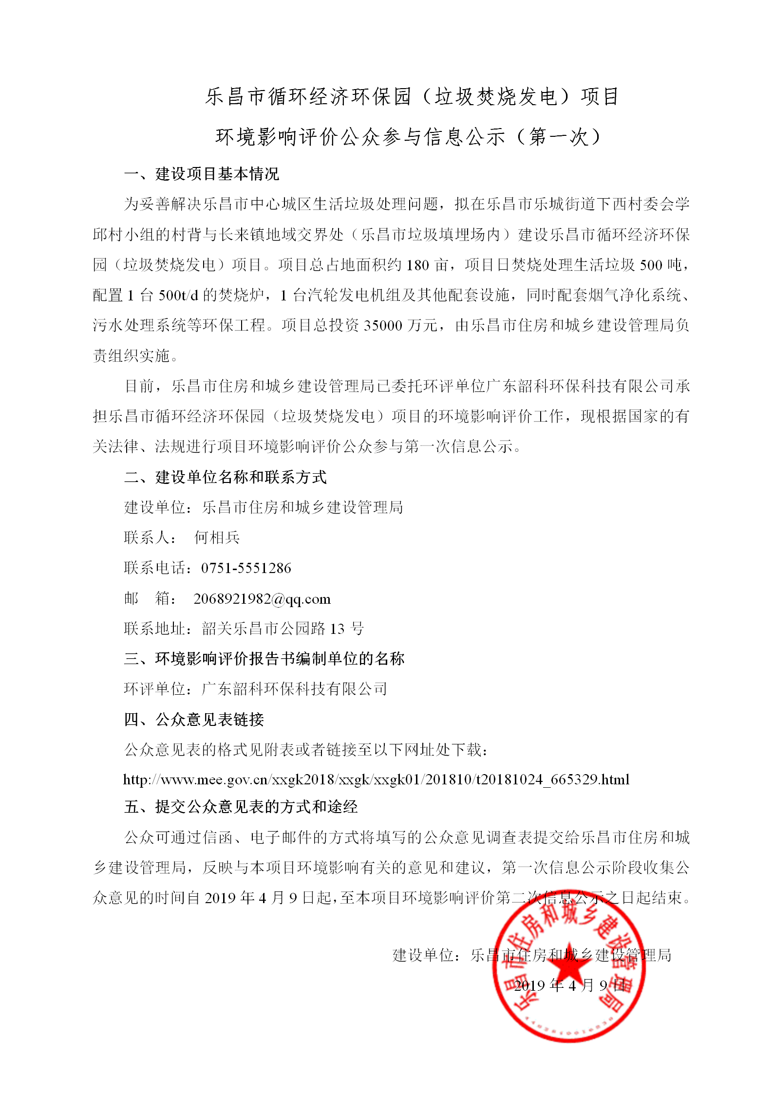 乐昌市循环经济环保园(垃圾焚烧发电)项目环境影响评价公众参与信息公示(第一次)