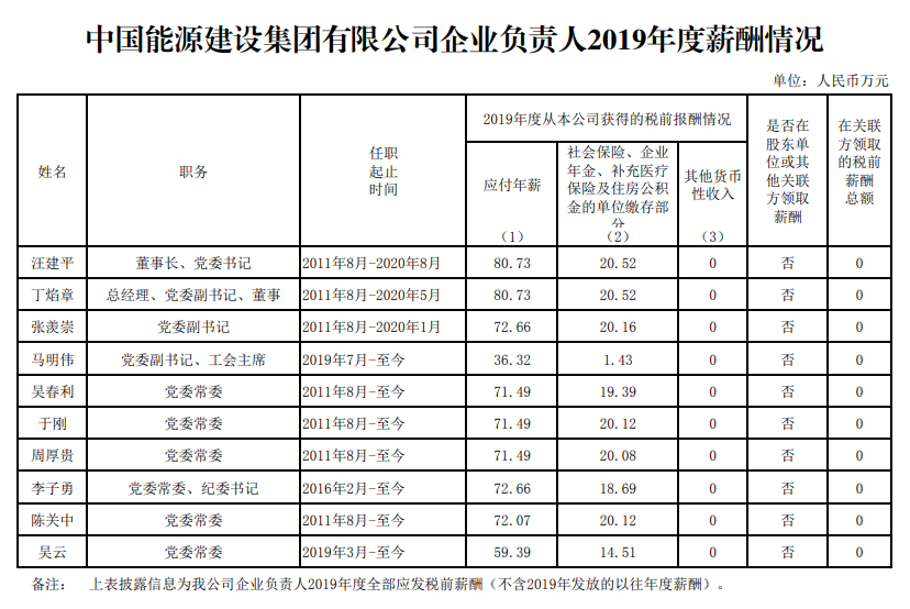 中国电力建设集团有限公司企业负责人2019年度薪酬情况