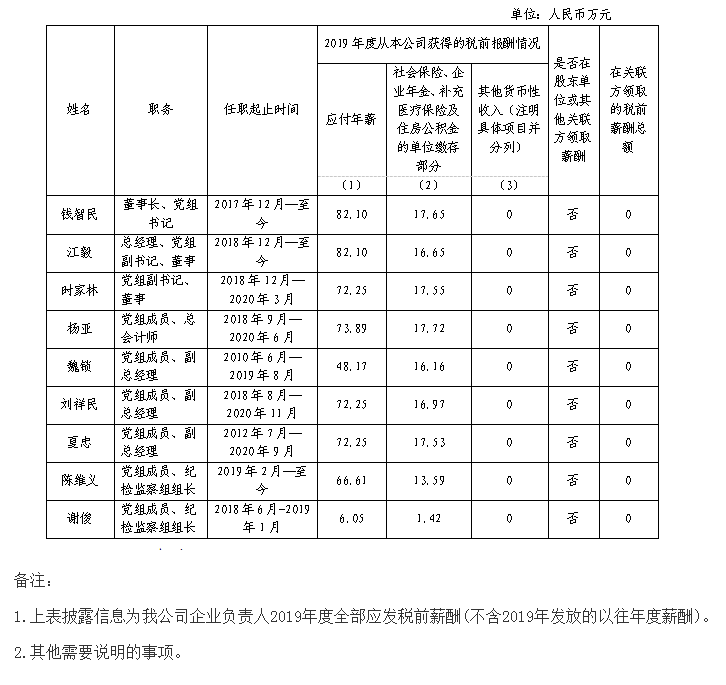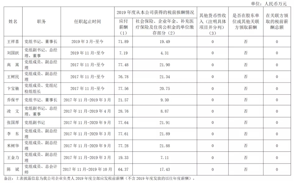 国家电力投资集团有限公司企业负责人2019年度薪酬情况