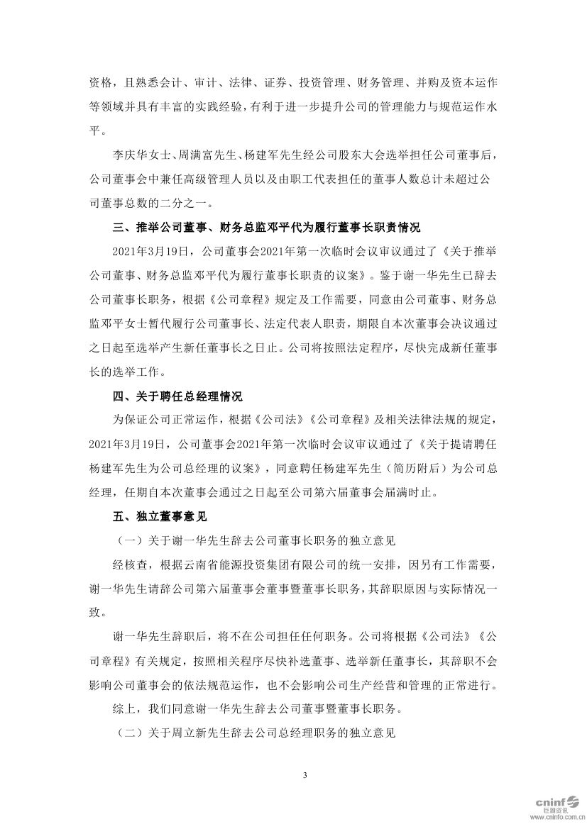 3月20日,云南能投发布公告称,因工作变动原因,谢一华请辞公司董事、董事长等职务,周立新请辞公司董事、总经理等职务,舒艺欣请辞公司董事等职务;同时,提名李庆华、周满富、杨建军为公司第六届董事会非独立董事候选人。由公司董事、财务总监邓平暂代履行公司董事长、法定代表人职责,并聘任杨建军为公司总经理。