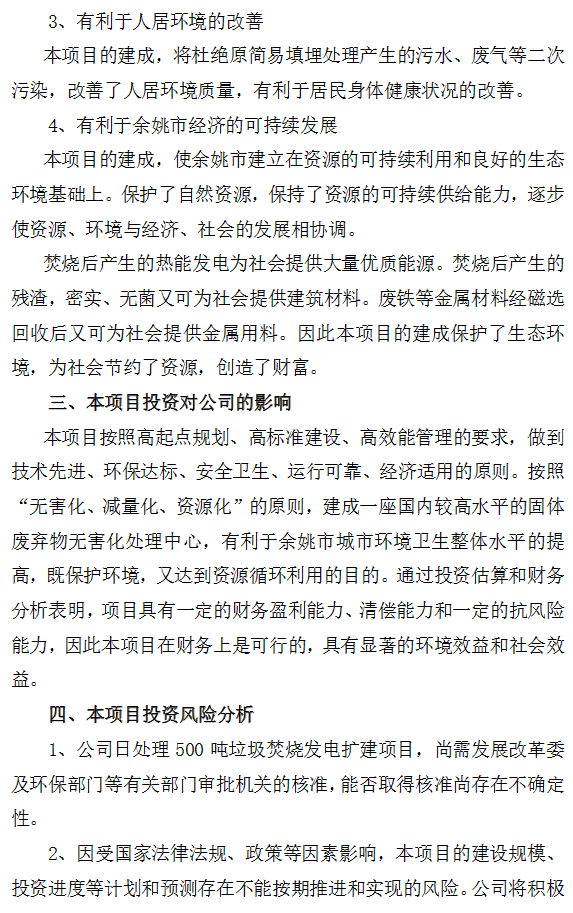 世茂能源公告,公司是余姚市处理生活垃圾焚烧发电的唯一厂家。由于余姚经济的发展,城乡垃圾的收集逐年在迅速增加,原有垃圾焚烧厂的垃圾池容积偏小,不能保证垃圾发酵,影响垃圾焚烧发电效率,特别是当每台垃圾焚烧炉检修投运的时候,3台500t/d无法满足全部垃圾焚烧的要求。为满足日益增长的垃圾处理要求,公司拟在厂区内扩建日处理500吨垃圾焚烧发电项目。