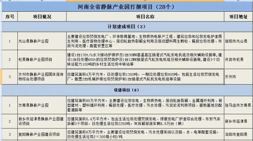 2020年,河南省重点建设项目名单中提到,续建项目中全省静脉产业园打捆项目28个,其中计划建成3个,续建8个,计划新开工17个,这也是2021年河南省静脉产业园进展动态频繁的主要原因。