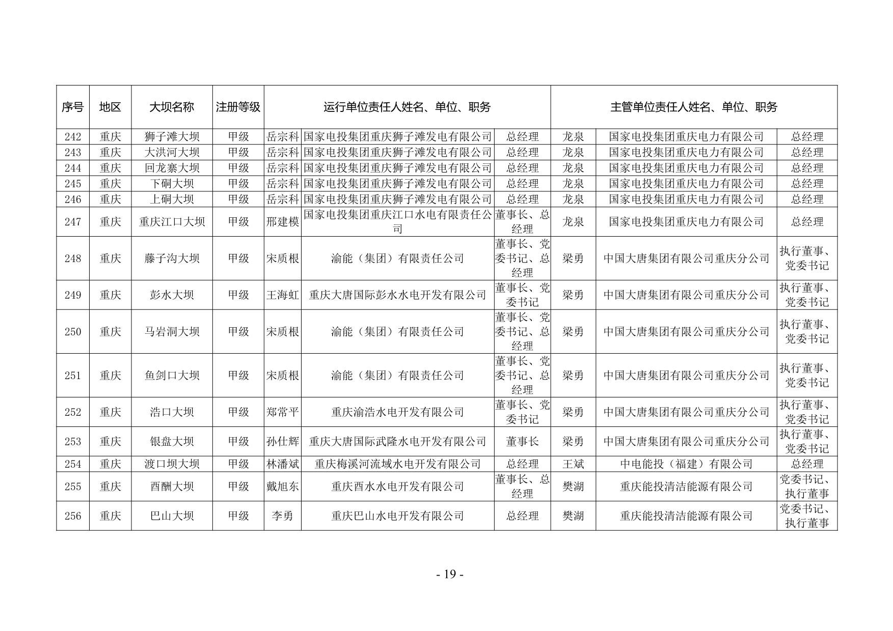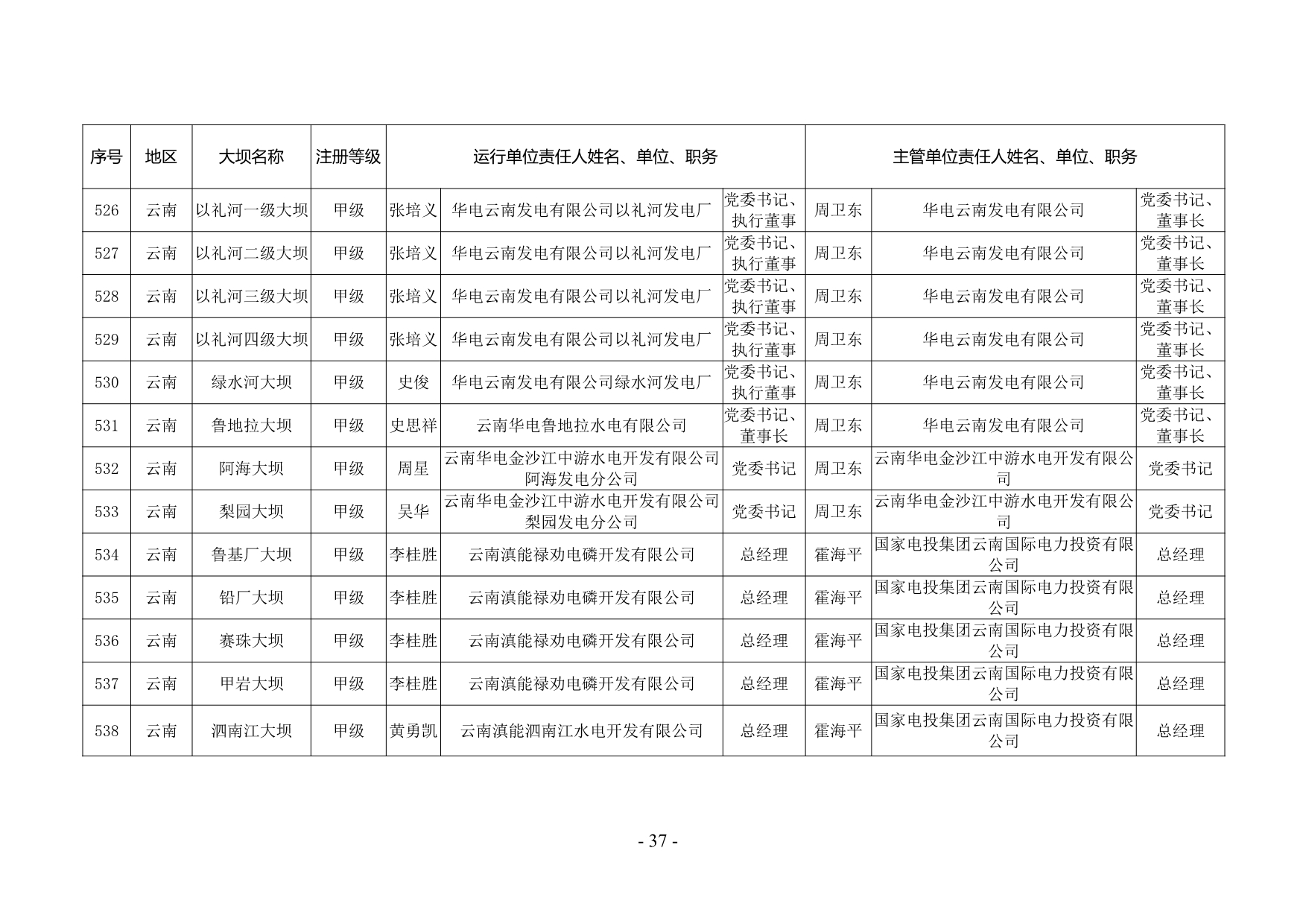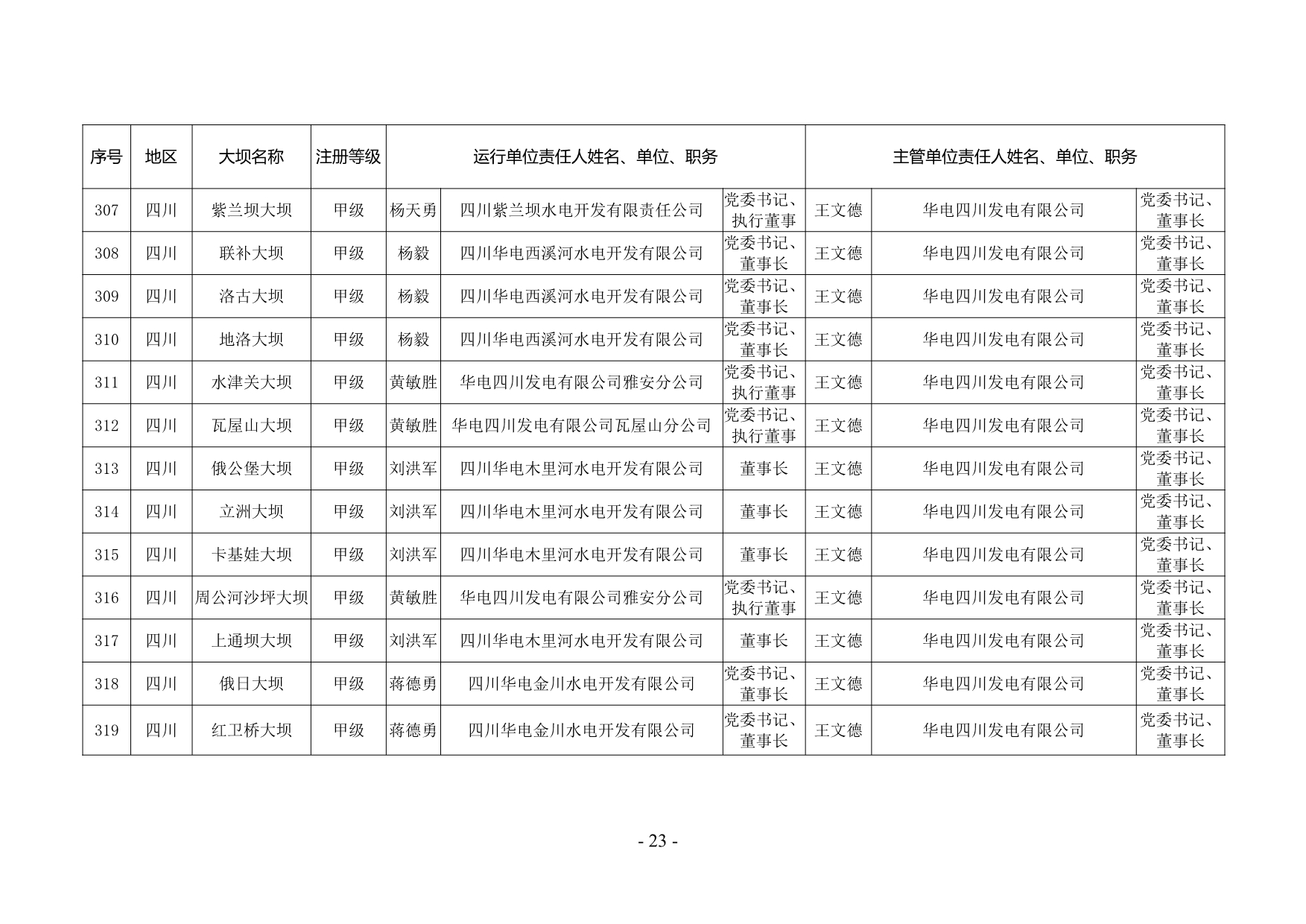 为进一步加强水电站大坝安全监督管理,压紧压实电力企业大坝安全主体责任,按照《水库大坝安全管理条例》《电力安全生产监督管理办法》(国家发展改革委令2015年第21号)《水电站大坝运行安全监督管理规定》(国家发展改革委令2015年第23号)等规定要求,现将电力行业681座注册登记和登记备案的水电站大坝(以下简称大坝)运行单位及主管单位的安全责任人名单予以公布。