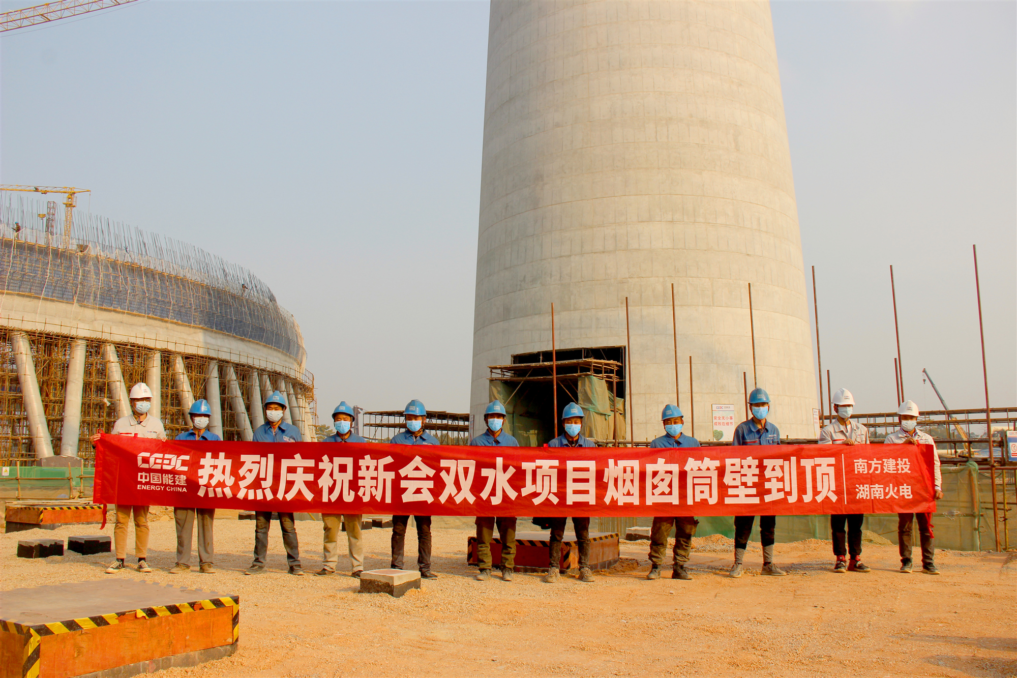 烟囱混凝土外筒的顺利封顶标志着新会双水项目工程施工进入新的阶段,也为烟囱钢平台及钢内筒安装打下了坚实的基础。