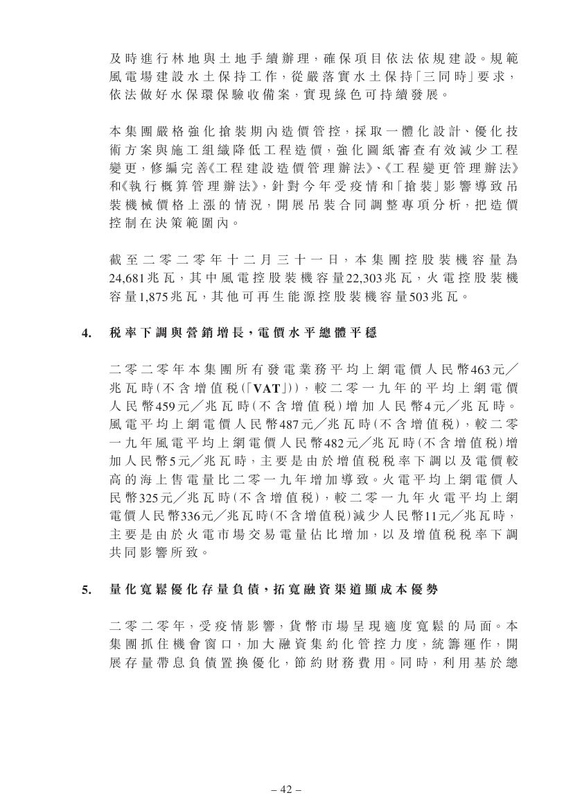 2020年,龙源电力所有发电业务平均上网电价463元╱兆瓦时(不含增值税),较 2019年增加4元╱兆瓦时。风电平均上网电价487元╱兆瓦时(不含增值税),较2019年增加5元╱兆瓦时,主要是由于增值税税率下调以及电价较高的海上售电量比2019年增加导致。