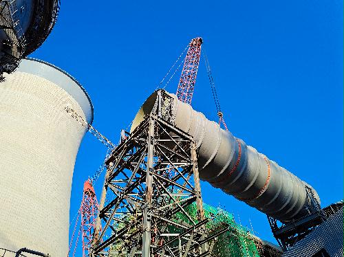 7月14日9时30分,永州百万机组工程#2排烟冷却塔塔外末段玻璃钢烟道顺利吊装就位。