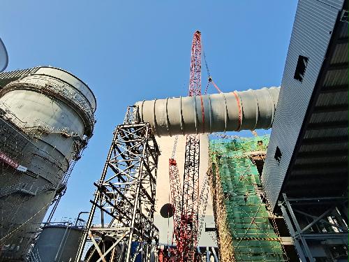 2号排烟冷却塔玻璃钢烟道共6段,分为塔内段、穿塔筒段和塔外4段,采用M18000履带吊79.2m主臂工况单机吊装。