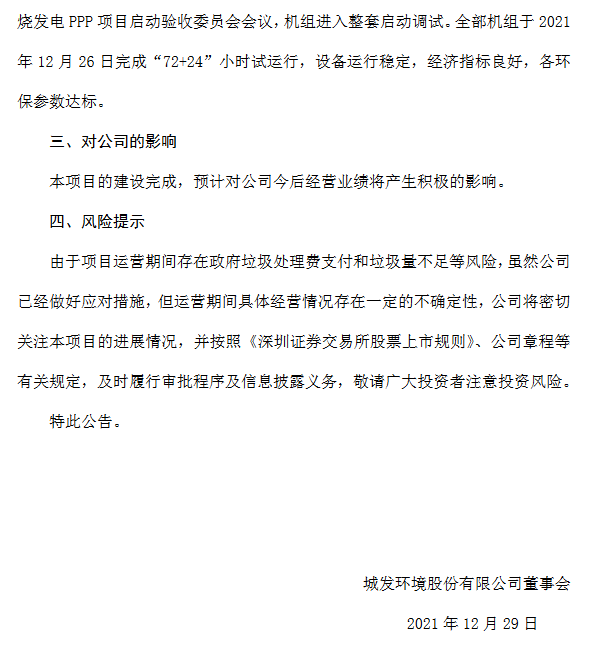 城发环境公布,截至2021年12月中旬,邓州市生活垃圾焚烧发电项目累计完成投资约5.2亿元。2021年12月3日,城发环保能源(邓州)有限公司召开邓州市生活垃圾焚烧发电PPP项目启动验收委员会会议,机组进入整套启动调试。全部机组于2021年12月26日完成“72+24”小时试运行,设备运行稳定,经济指标良好,各环保参数达标。
