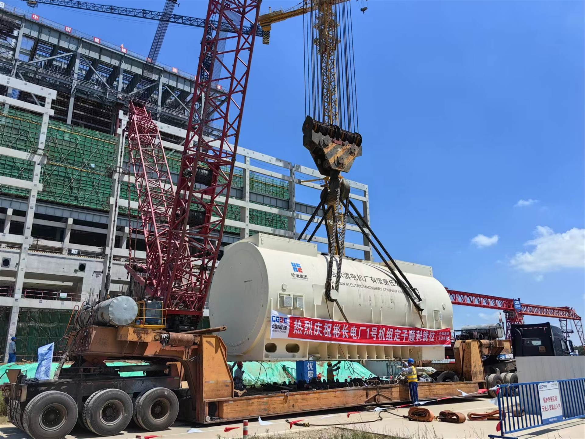 8月14日,由中国能建天津电建承建的国能彬长项目660兆瓦CFB超超临界机组发电机定子顺利吊装就位。