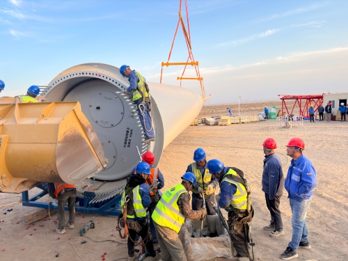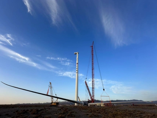 2023年10月11日上午8时18 分,由上海电力安装第二工程有限公司EPC总承包的京能玉门新民堡10万千瓦风电项目首台风机顺利完成吊装。