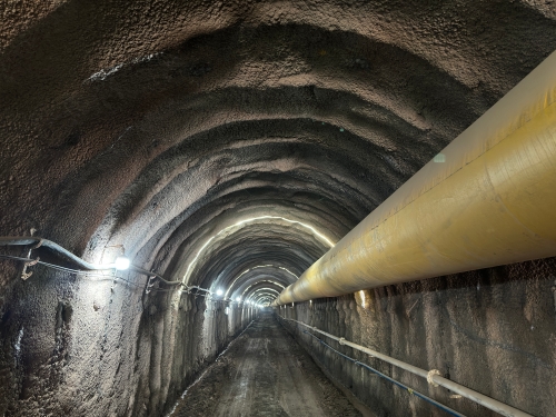 自流排水洞与厂房下层排水廊道相连,作为厂房系统洞室的排水通道,其采用城门洞型设计,全长约2264米,净空尺寸为3 米×3 米,属于长距离超小断面隧洞。截至目前,自流排水洞已完成 约1113 米,剩余约1150米部分仍在施工中。