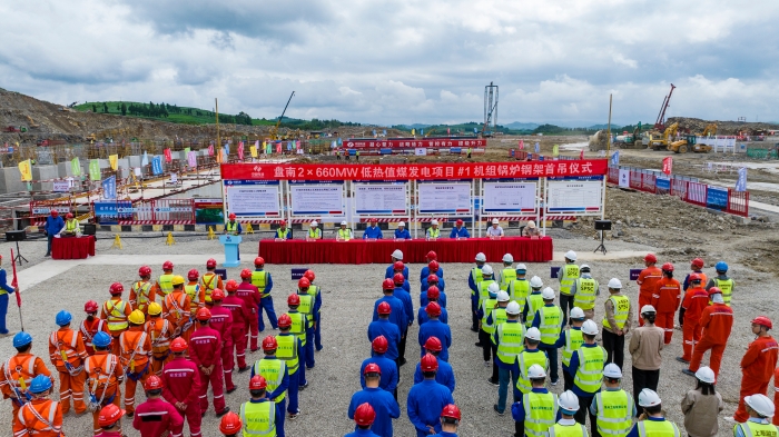 张积鹏宣布贵州盘南2×600兆瓦低热值煤发电项目1号锅炉钢架开始吊装。随着第一根钢架的精准吊装就位,项目建设开启了新篇章。